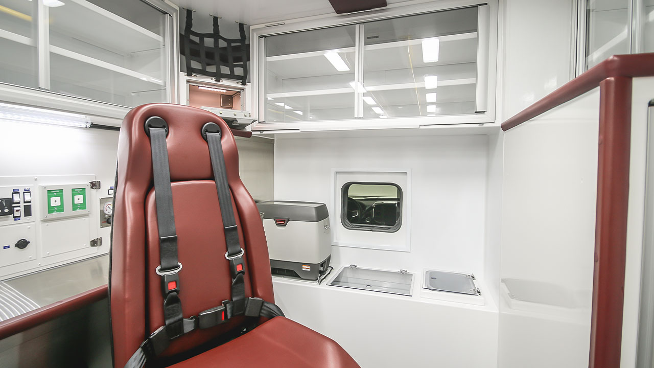 This custom 14 ft Type I EMS vehicle is mounted onto a new RAM 5500 gasoline chassis and features an Onan generator and a LiquidSpring suspension system. Features include the Ferno iNLINE Cot Fastening system, Technimount Medical Mount Systems, double-wide CPR seat, and LifeDefender cabinets by Austin Hardware.