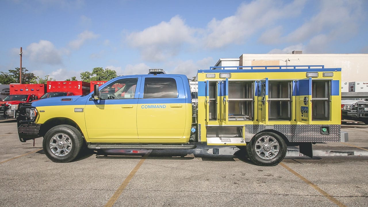 This custom 9 ft First Responder Vehicle is mounted onto a new RAM 3500 diesel chassis and features a large array of unique storage options. Features include a Ranch Hand Front Bumper, Warn Powered Winch and Tomar Emergency Lighting.