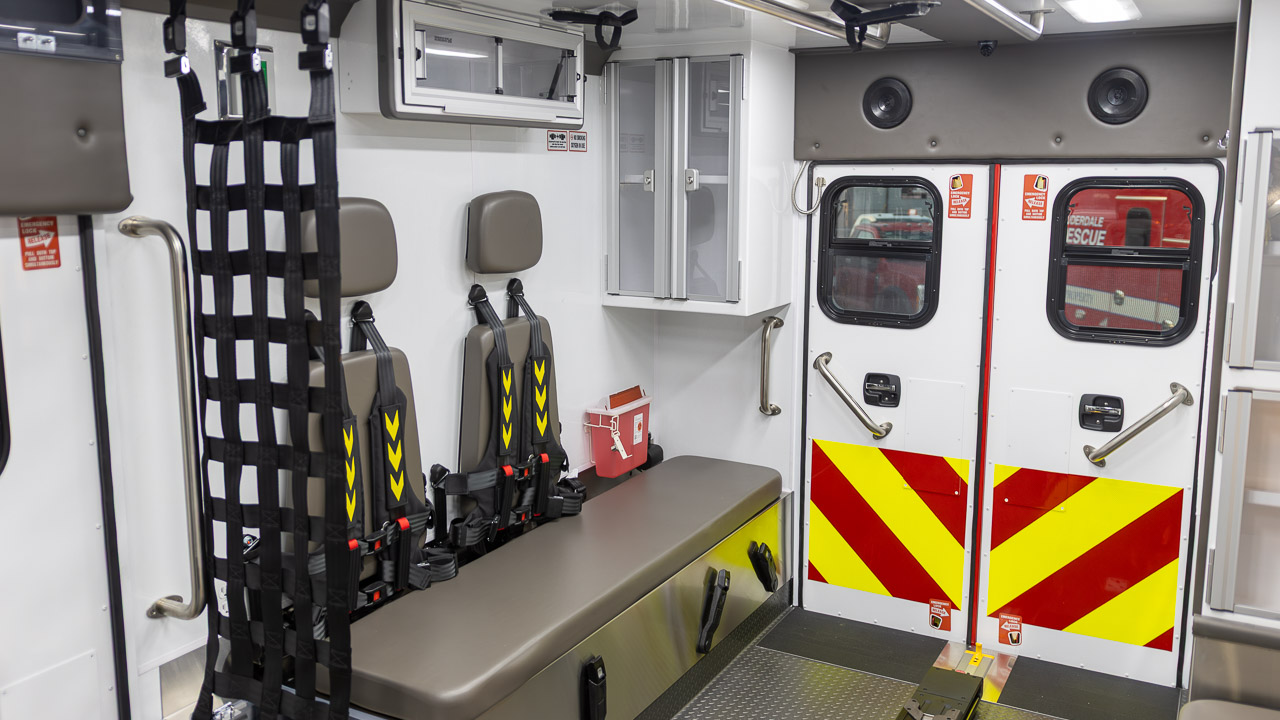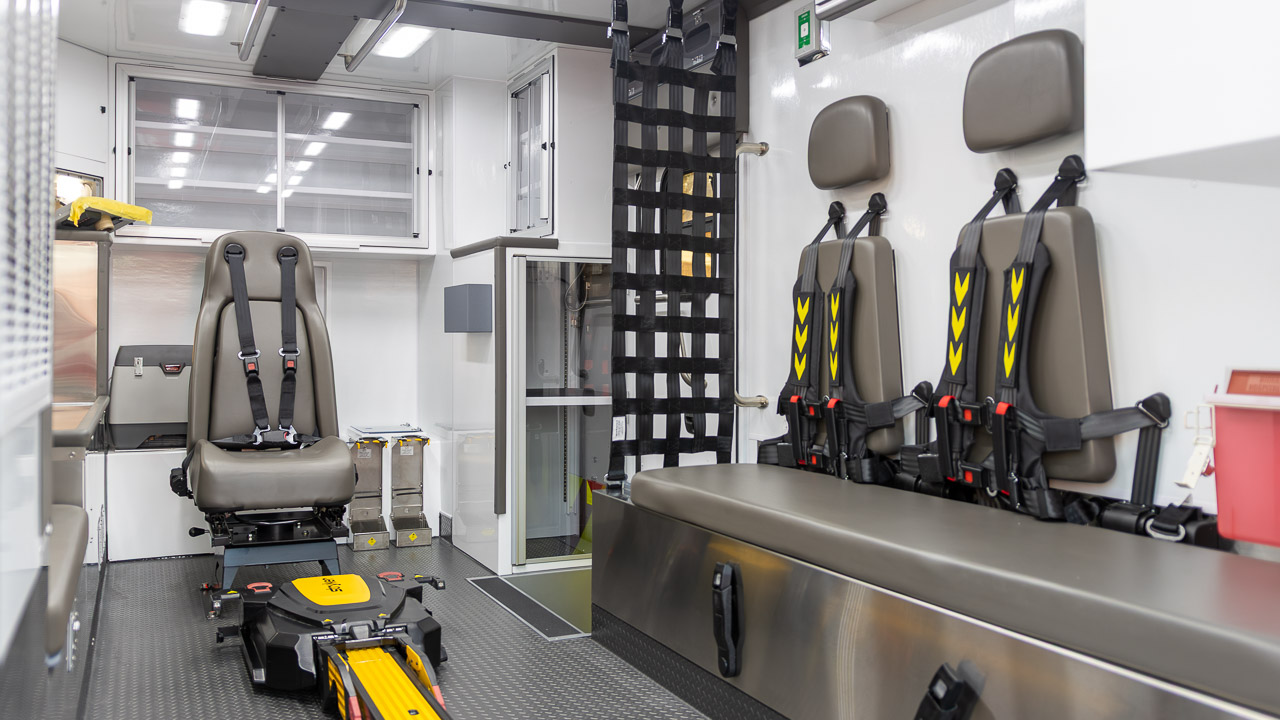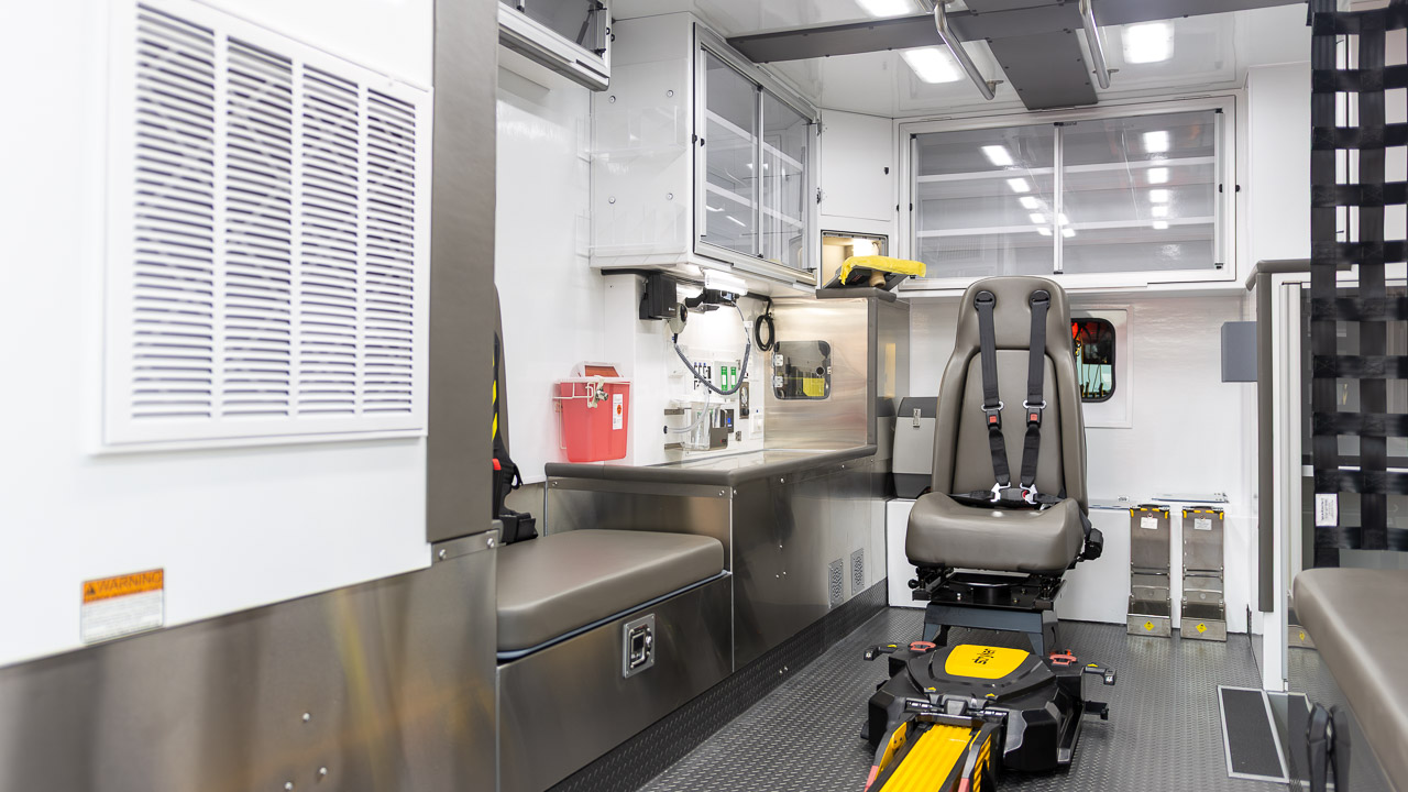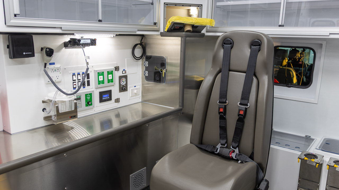 Inside, the unit includes a gunmetal grey interior with stainless steel countertops, MedVault with WiFi, upper linen cabinets, a 15 Qt. Engel fridge, dual squad bench seating with 6-point harnesses, and a Captain’s Chair with an integrated child safety seat. Cot retention is handled by a Frazer-installed Stryker Power-LOAD Gen 2 system.