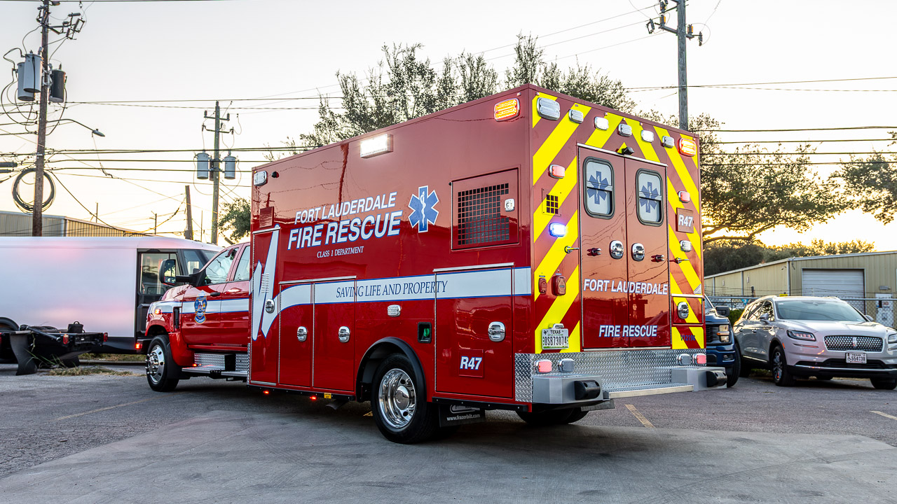 This custom 14 ft Type I EMS Vehicle for Fort Lauderdale Fire Rescue is built on a 2024 International CV515 diesel crew cab chassis and features a MEPS under-hood generator and LiquidSpring Suspension System. The module is finished in Race Red with custom graphics designed, produced, and installed by Frazer in full collaboration with the customer. Exterior features include Whelen M-series emergency lighting, Pioneer Plus scene lights, a full replacement bumper with grille guard, dual air horns, Luverne running boards, and a Dometic self-contained HVAC system.