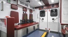 This 12 ft. custom Type I EMS vehicle is mounted onto a new Ford F-350 diesel chassis and features a LiquidSpring suspension system and a Cummins Onan Gasoline Engine Generator. Other features include a Stryker Power-LOAD Powered Cot Fastener and LifeDefender cabinets by Austin Hardware.