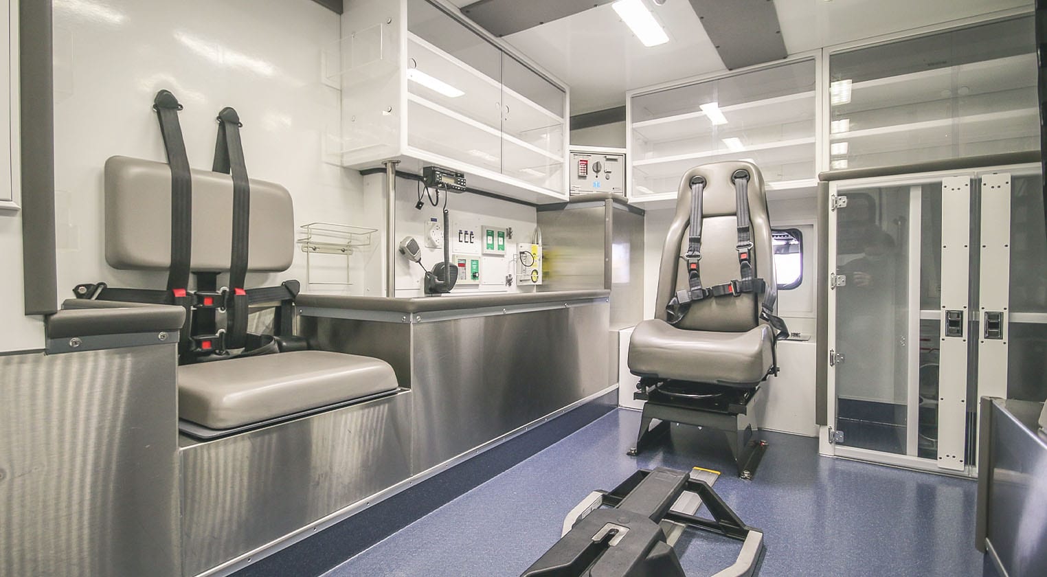 This custom 12 ft Type I EMS vehicle is remounted onto a new Ford F-450 diesel chassis and features an Onan Generator and a LiquidSpring suspension system. Features include a Stryker Performance-LOAD Cot Fastener and 6pt harnesses.