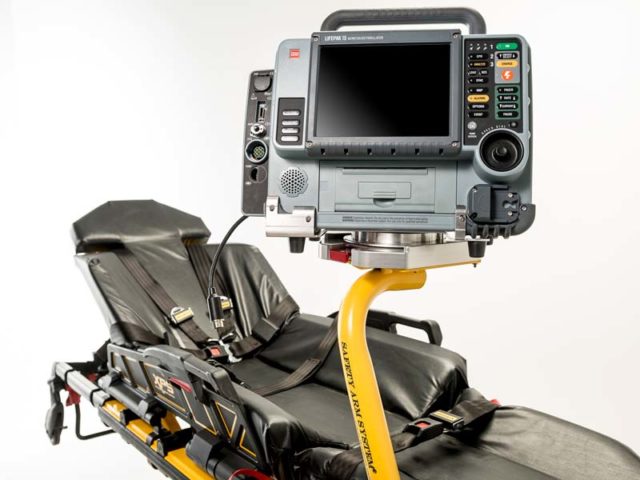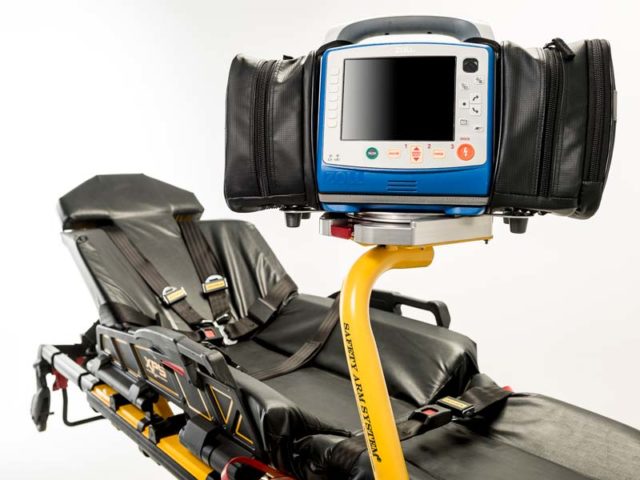 The Safety Arm 500 Model mounting system for Stryker stretchers allows you to take your defibrillators with you safely from one place to another on the patient’s stretcher. You simply need to have the right Technimount Bracket Pro Serie that adapts to your defibrillator device. We have safety arms that fit on both the left side and the right side of the Stryker stretchers, depending of your layout.